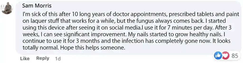 But then, I stumbled upon this FungaBeam Nail Fungus Light. I thought to myself, ‘Why not give it a try? ‘ So, I started using it as directed, just a few minutes a day . And let me tell you, it’s been a total game-changer! After just a couple of weeks, I started noticing a real difference. My nails began to look clearer, the thickness reduced, and the pain slowly faded away.