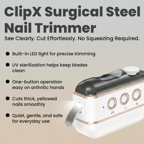 Those yellowed, rock-hard toenails that regular clippers just slide off of? ClipX handles them. The surgical steel blade combined with the motor’s power slices through even the toughest, thickest nails—the kind that come with age, fungus, or just stubborn genetics. No more multiple attempts, no more clippers breaking or bending, no more feeling defeated by your own toenails. It cuts clean on the first try, leaving smooth edges instead of that jagged mess traditional clippers leave behind.