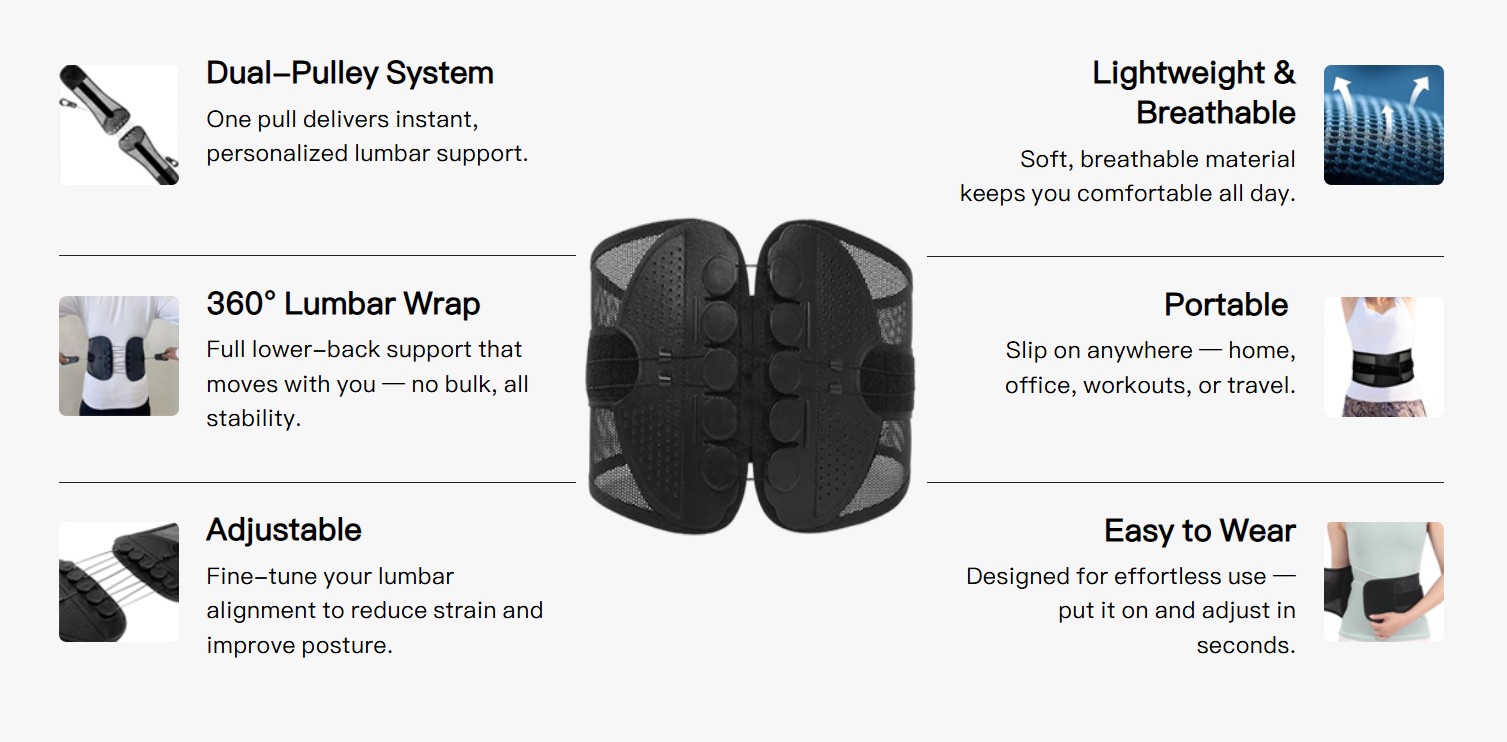 The dual-pulley design lets you adjust your brace with a single pull, delivering precise, personalized support for your lumbar region. Unlike traditional belts, it evenly distributes pressure, stabilizes your spine, and provides immediate relief, making it perfect for daily wear or long workdays.