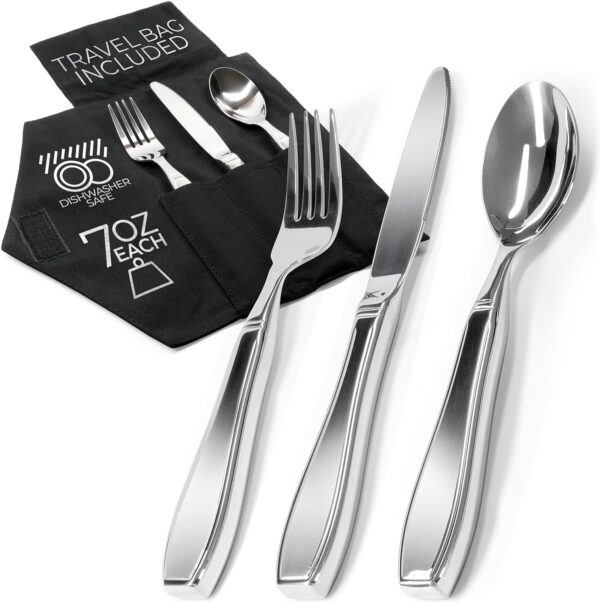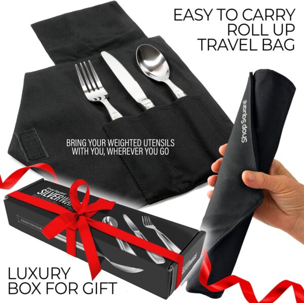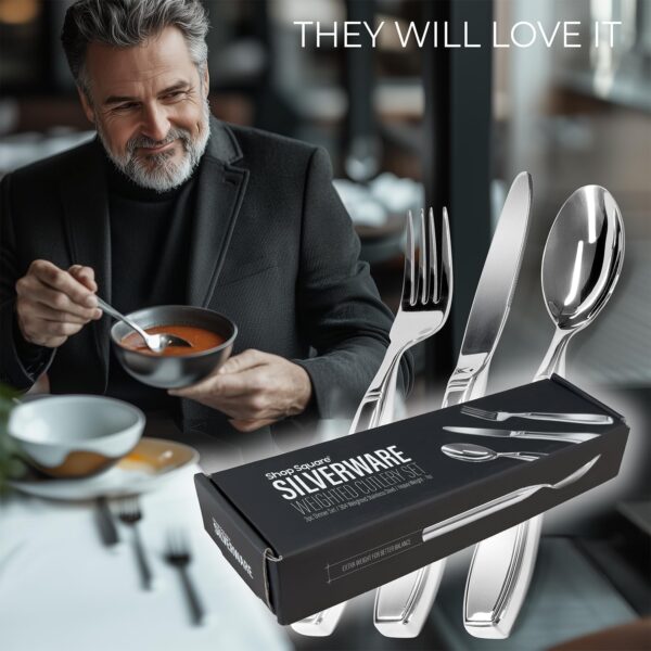 They genuinely look like standard flatware—same sleek stainless steel finish, similar shape and style. The only difference is they’re slightly thicker to accommodate the extra weight, but it’s not obvious unless someone is specifically looking for it. At a restaurant table or family dinner, they blend in completely. Most users report that no one has ever commented or even seemed to notice they’re using different utensils.