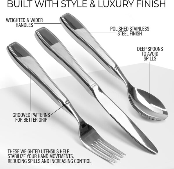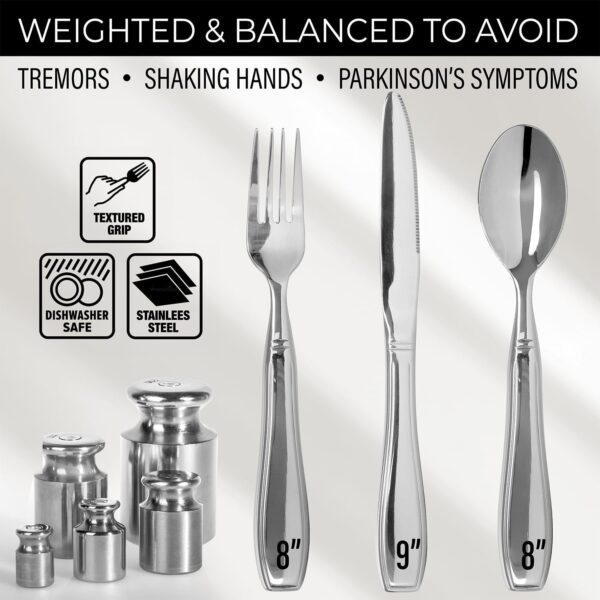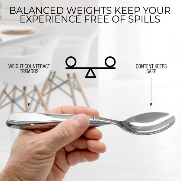 Each piece weighs at least 7 ounces—heavy enough to counteract hand tremors without feeling awkward to lift. The weight distribution is carefully balanced so the utensils feel natural in your hand, not front-heavy or difficult to maneuver. This added heft works with gravity to steady your grip, making it easier to guide food from plate to mouth without as much shaking. It’s a simple physics solution that makes a real difference at mealtime.